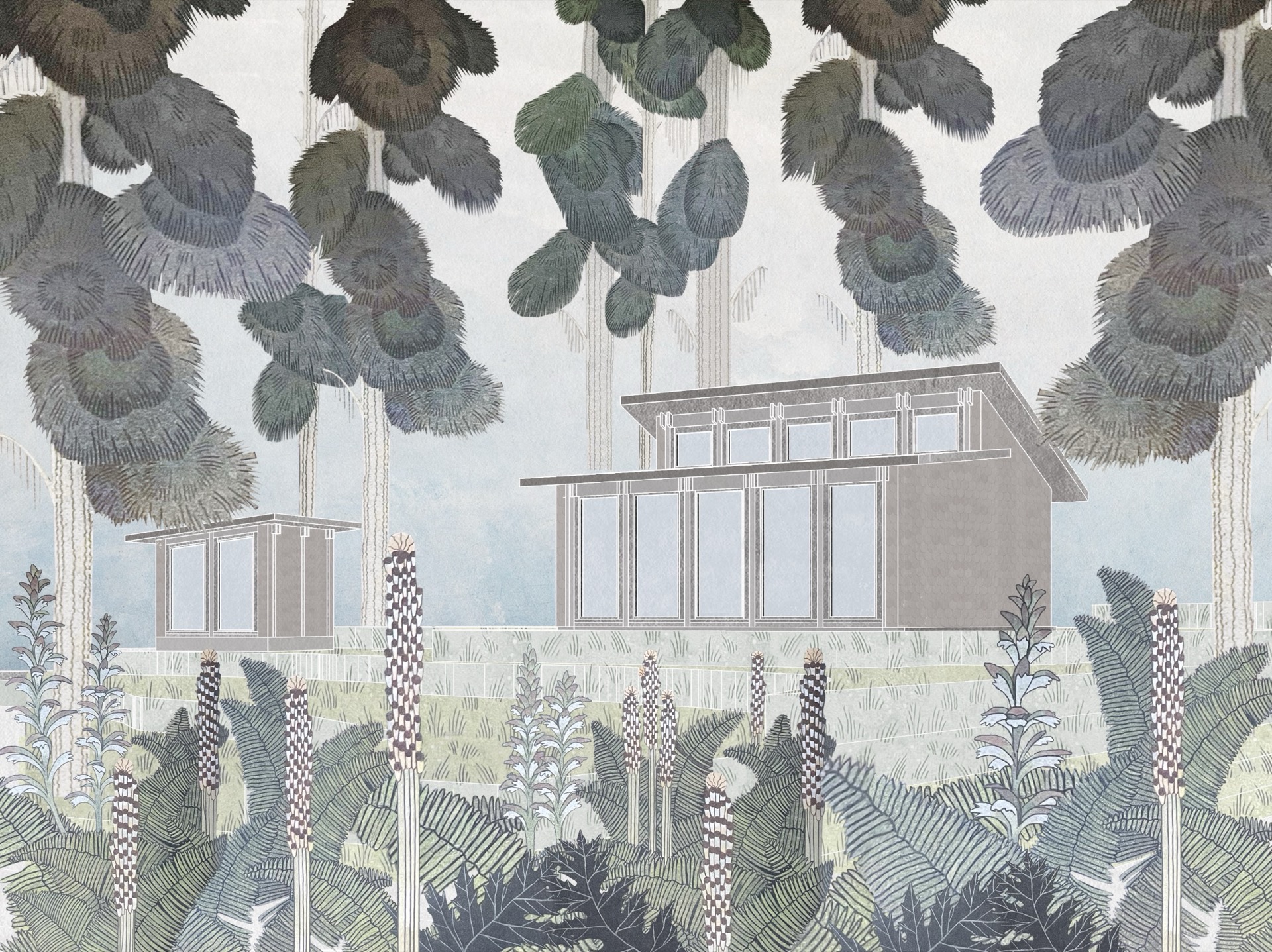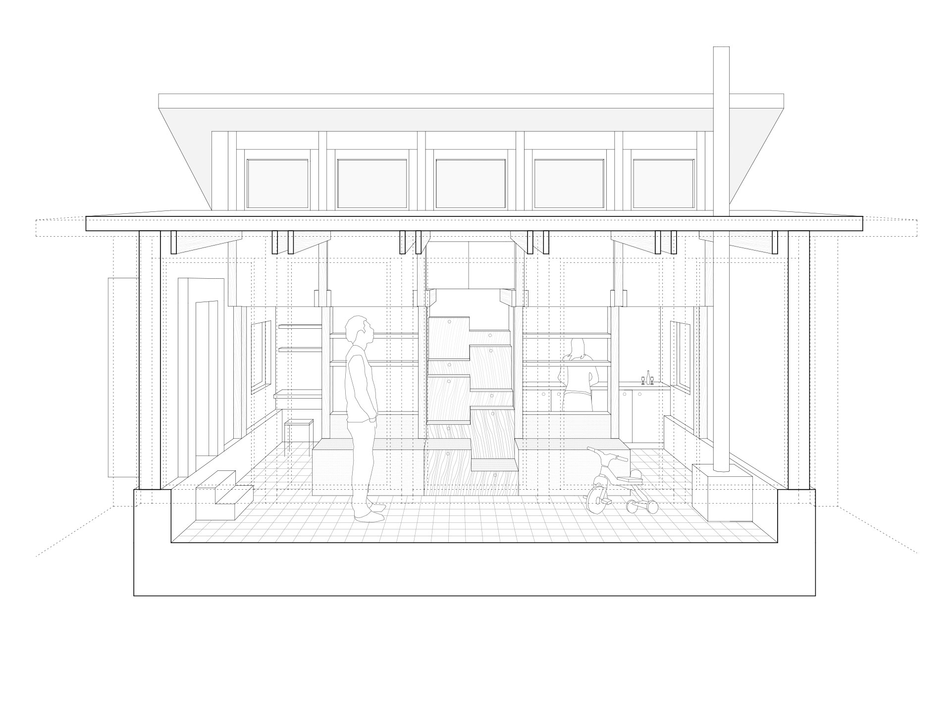 The new house occupies the footprint of the original while reinterpreting its spatial logic. The design positions the building in dialogue with the surrounding homes and the forest, respecting the existing scale, proportions and site constraints. One half of the structure retains the compact form of the original bungalow, while the other rotates outward to open fully toward the trees. Lowering the floor by 45 centimetres brings the interior closer to ground level, enhancing the connection with the forest floor and creating a more intimate view. Within strict height limits, this adjustment also generates space for a small sleeping platform above.