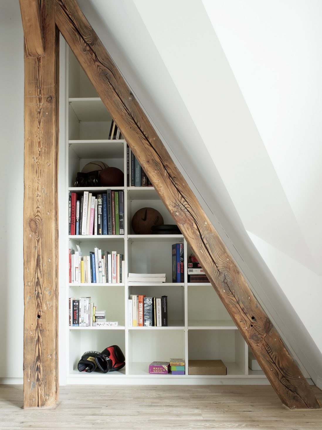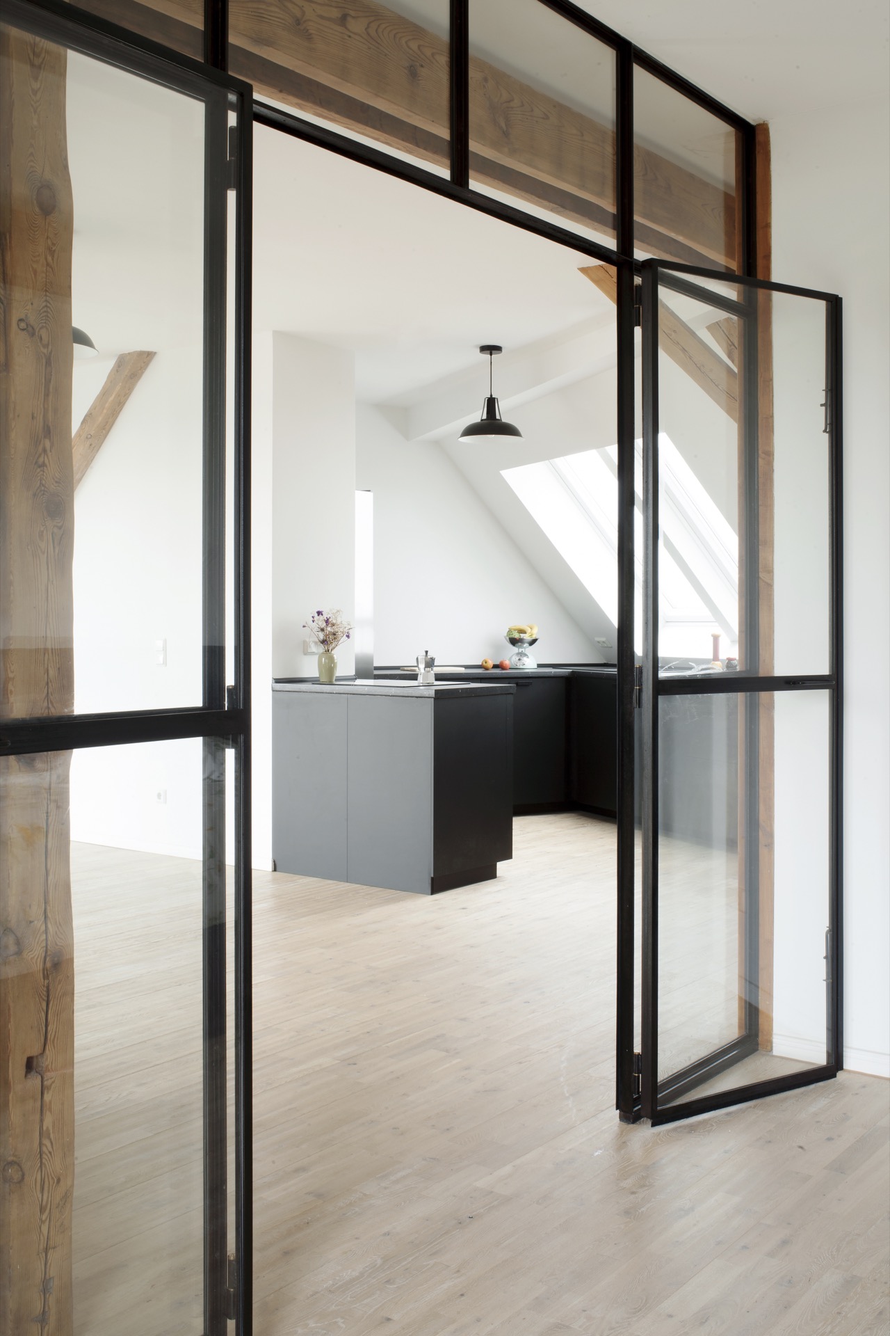 The wooden structure of the penthouse is revealed, stripped of non-structural finishes and partitions accumulated over the years. Materials remain simple and refined: restored wood, black and white steel frames, kitchen and bathroom details, and carefully placed touches of colored tiles define the character of the space.